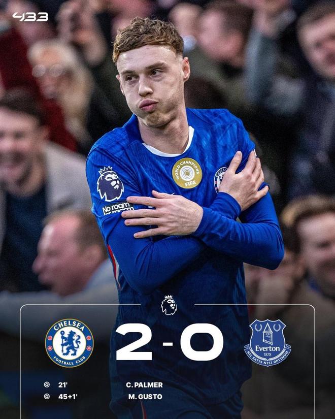 切尔西主场2-0埃弗顿,终结各项赛事4场不胜。霍尔伤退,古斯托助攻帕尔默破门,加纳乔失良机,内托助攻古斯托再下一城。